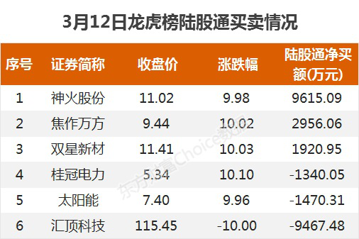 数据来源:东方财富Choice数据陆股通买卖情况陆股通参与龙虎榜中个股共涉及6股,其中3股被机构净买入,神火股份被买入最多,为9615.09万元。另外3股被机构净卖出,汇顶科技被卖出最多,为9467.48万元。