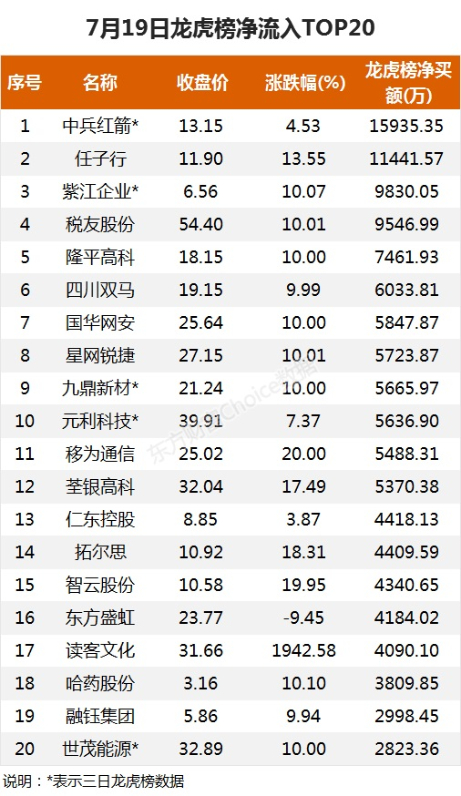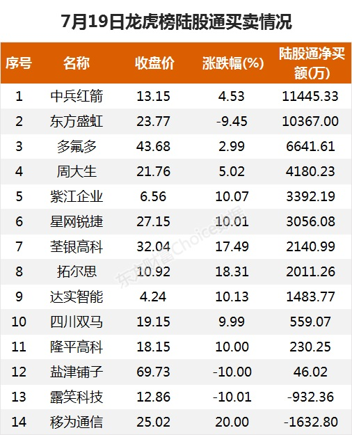 【龙虎榜:1.6亿抢筹中兵红箭 外资净买12股 机构净买11股】7月19日,三大指数维持震荡,截至收盘,沪指跌0.01%,报收3539点;深成指涨0.14%,报收14992点;创业板指涨0.49%,报收3449点。盘面上,种植业与林业、中药、通信设备涨幅居前,园区开发、造纸、电力等跌幅居前。
