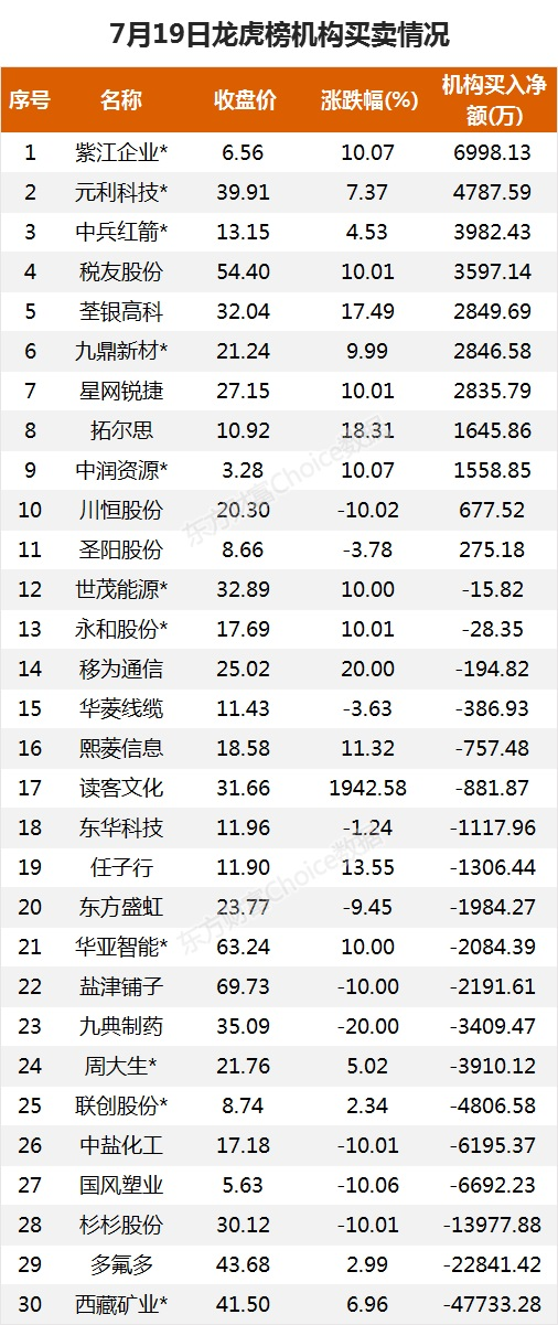 机构参与龙虎榜中个股共涉及30股,其中11股被机构净买入,紫江企业被买入最多,三日净买入6998.13万元。另外19股被机构净卖出,西藏矿业被卖出最多,三日净卖出4.77亿元。