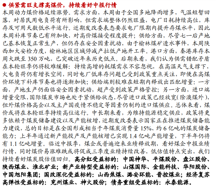 开源证券表示,供需错配矛盾在本轮旺季仍将较难缓解:持续高增的耗煤需求不容忽视,在高温天气支撑下,火电负荷仍有增长空间,同时电厂低库存问题已受到政策重点关注,即便在高煤价环境下补库节奏也将逐渐加快;供给端则较难在短期内释放出匹配增量:一方面,产地生产仍面临安全因素扰动,超产受到政策严格管控;另一方面,进口端增量受限,国际煤炭市场也处于紧供给状态,尽管进口政策已经放宽(除澳煤外),但外煤价格高企以及主产国疫情不稳定等因素仍制约进口煤供应。总体来看,煤价或将在本轮旺季持续高位运行。中长期来看,为维持能源稳定供应,政策将更多依赖于煤炭储备建设以及产能核增,近期发改委表示国家正在推进煤炭储备能力建设,总的目标是在全国形成相当于年煤炭消费量15%、约 6 亿吨的煤炭储备能力;上半年通过新产能投产及产能核增已实现 1.4 亿吨产能增量,下半年仍将有 1.1 亿吨增量。