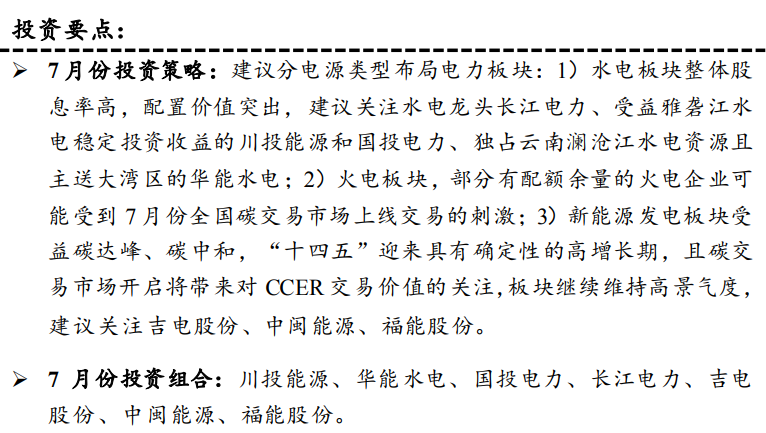 财信证券指出,建议分电源类型布局电力板块:1)水电板块整体股息率高,配置价值突出,建议关注水电龙头长江电力、受益雅砻江水电稳定投资收益的川投能源和国投电力、独占云南澜沧江水电资源且主送大湾区的华能水电;2)火电板块,部分有配额余量的火电企业可能受到7月份全国碳交易市场上线交易的刺激;3)新能源发电板块受益碳达峰、碳中和,“十四五”迎来具有确定性的高增长期,且碳交易市场开启将带来对CCER交易价值的关注,板块继续维持高景气度,建议关注吉电股份、中闽能源、福能股份。