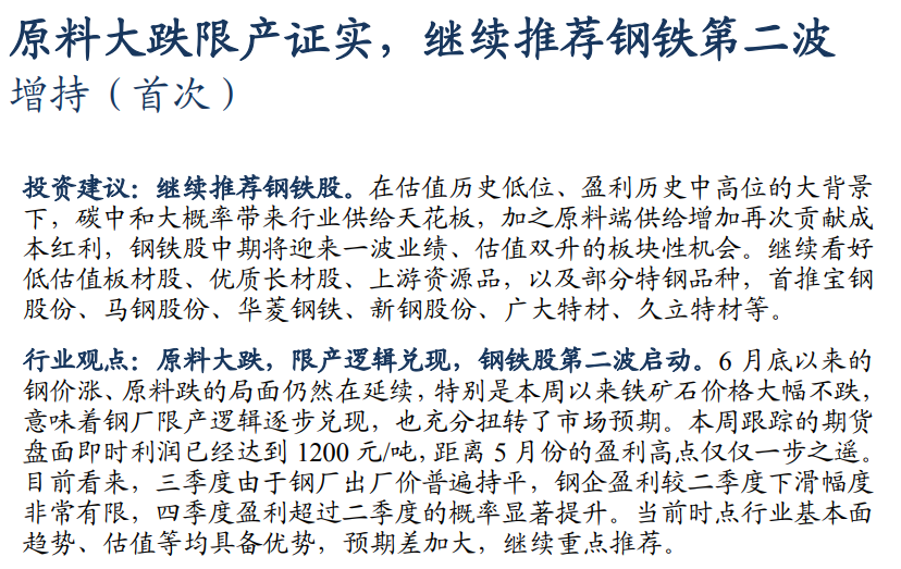 东吴证券提到,继续推荐钢铁股。在估值历史低位、盈利历史中高位的大背景下,碳中和大概率带来行业供给天花板,加之原料端供给增加再次贡献成本红利,钢铁股中期将迎来一波业绩、估值双升的板块性机会。
