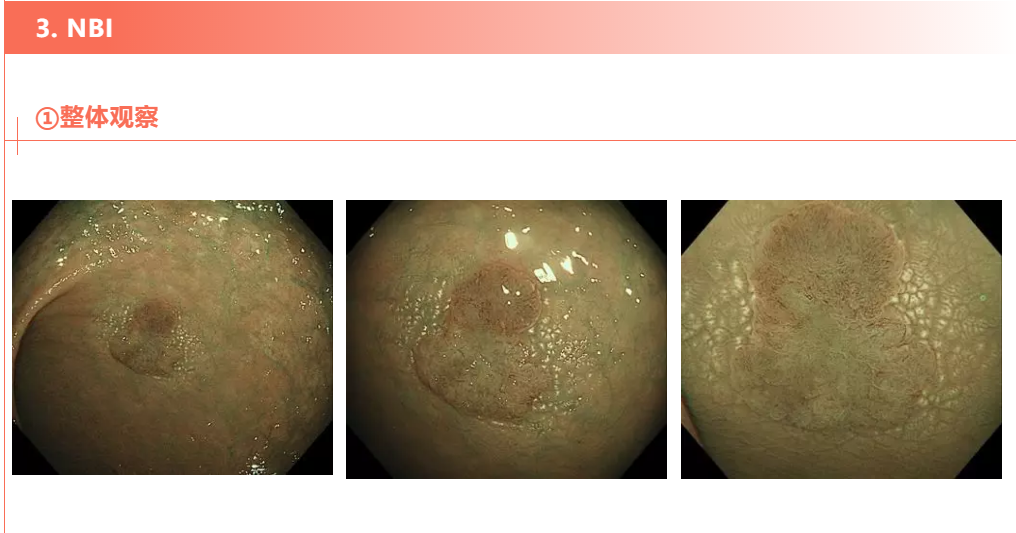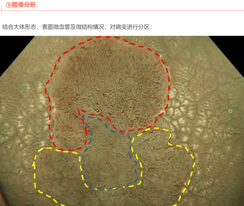 ②结合病变的大体形态、表面微血管及微结构的情况,先讲病变分区,各区域分别归类。