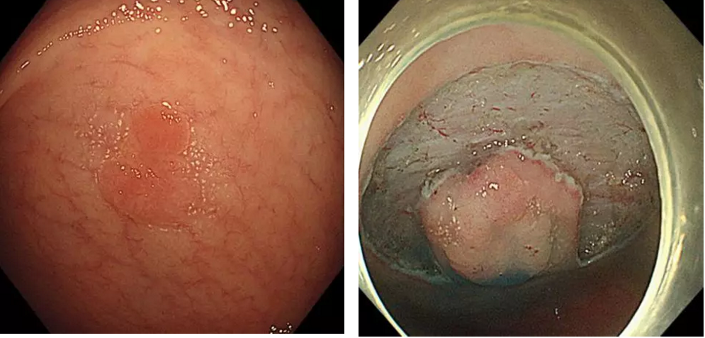 结合病例口侧隆起处的豁口,这个病例是不是非常符合图上红框中这种形态变化呢?依据目前大肠癌的内镜诊疗指南,结合术后病理评估,本病例符合治愈性切除。现密切随访中。