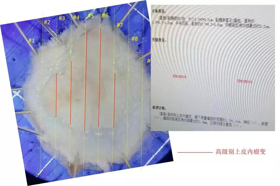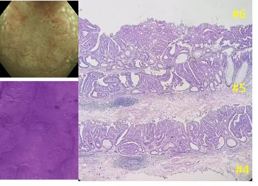 病理读片:病变区域腺管呈双层结构。上层为肿瘤腺管,符合高级别上皮内瘤变改变;间质较肛侧明显减少,其中毛细血管明显减少。下层为正常腺管,呈横向长椭圆型,共1层腺管构成,越靠近病变中央横行越明显,直至消失。第6号组织条上,蓝框区域(口侧隆起处略凹陷、与中央凹陷相沟通的部位),与第5、4号组织条肿瘤腺管相比,其结构异型性更加明显。