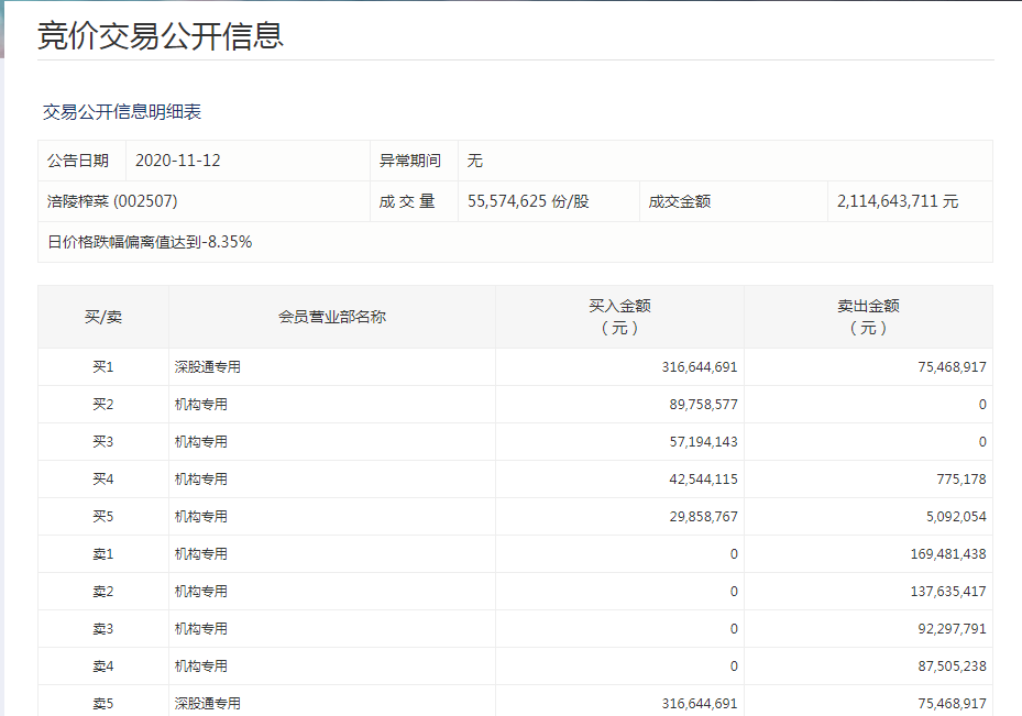 11月12日,涪陵榨菜盘中大跌8%。股吧里一片哀嚎之声,有投资者表示:“赔得裤衩都没了。”盘后数据显示,卖出的前五大席位中,前四大席位均为机构,4家机构席位合计卖出4.87亿元。(中国证券报)