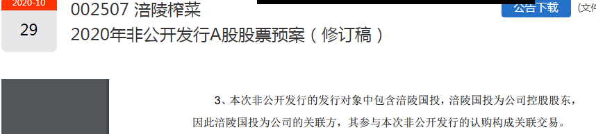 就在股价大跌的前一日(11月11日),涪陵榨菜刚披露了最新的非公开发行A股股票预案。