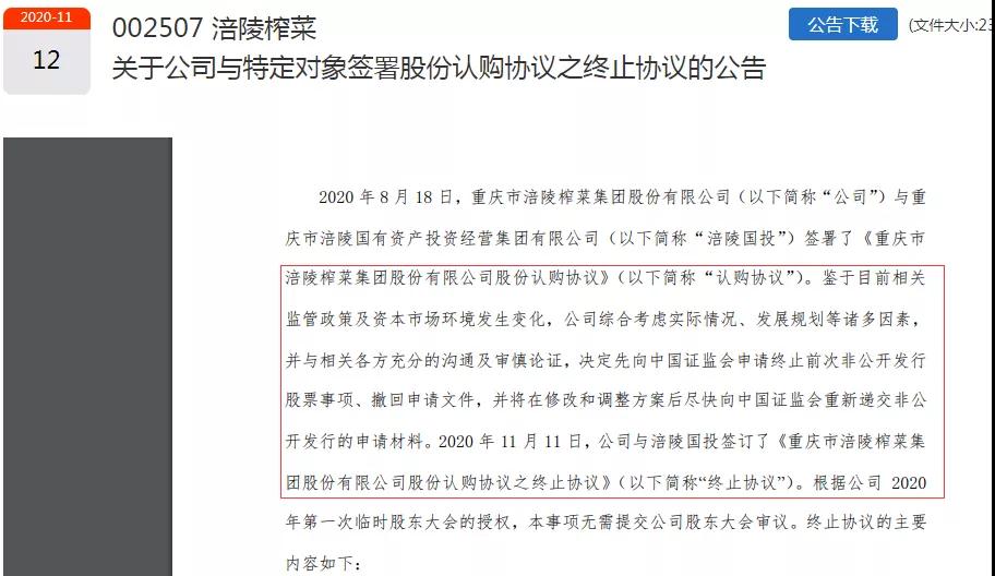 11月11日晚间,公司又公告,鉴于目前相关监管政策及资本市场环境发生变化,公司综合考虑实际情况、发展规划等诸多因素,并与相关各方充分的沟通及审慎论证,决定先向中国证监会申请终止前次非公开发行股票事项、撤回申请文件,并将在修改和调整方案后尽快向中国证监会重新递交非公开发行的申请材料。11月11日,公司与涪陵国投签订了《重庆市涪陵榨菜集团股份有限公司股份认购协议之终止协议》(简称“终止协议”)。