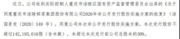 11月12日晚间,公司公告,近日,公司收到实际控制人重庆市涪陵区国有资产监督管理委员会出具的《关于同意重庆市涪陵榨菜集团股份有限公司2020年非公开发行股份实施方案的批复》,同意公司本次非公开发行股份实施方案,本次发行股份不超过1.42亿股(含本数),未超过本次发行前公司总股本的30%。